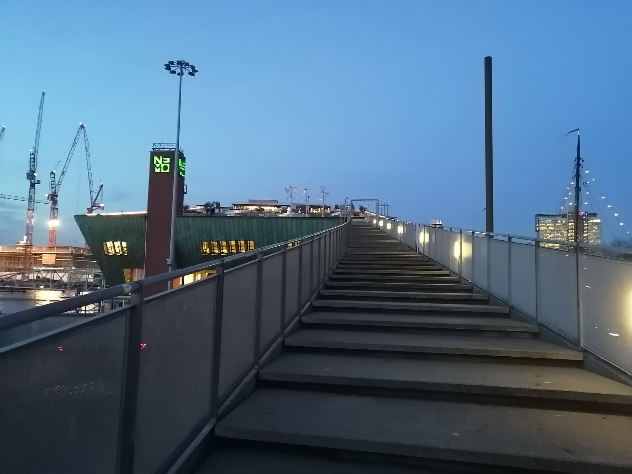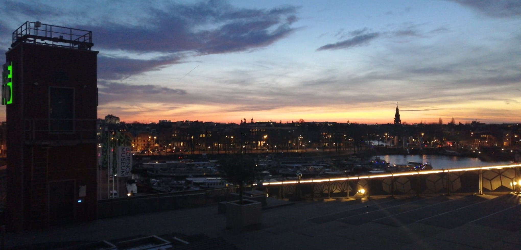 Para ver el Atardecer mi recomendación es la terraza del Museo NEMO con la icónica silueta de la Basílica de St.Nicholas en contra del sol con la suerte de unas cuantas nubes a los costados que harán que quieras guardar esa instantánea en tus recuerdos para siempre.